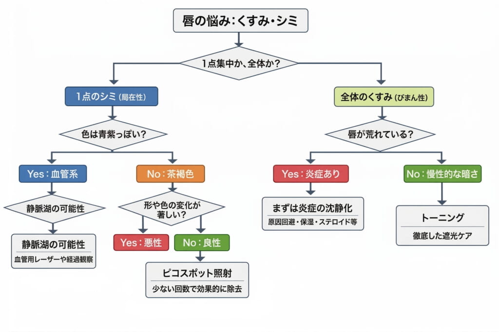 唇の色調トラブルは、大きく分けて「全体的なくすみ(びまん性)」と「部分的なシミ(局在性)」に分類されます。