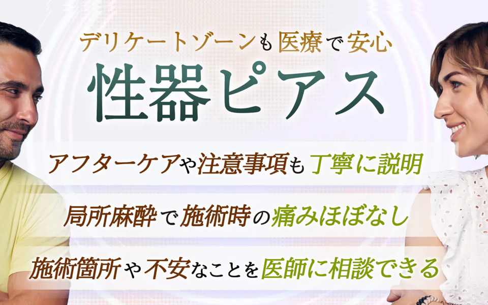 性器のようなデリケートな部位のピアス施術は医療機関で医師に任せることをお勧めいたします。現在、ピアススタジオやご自身でピアッシングを行うケースがありますが、医師法に抵触するうえに施術後のトラブルが多くみられるため非常に危険です。