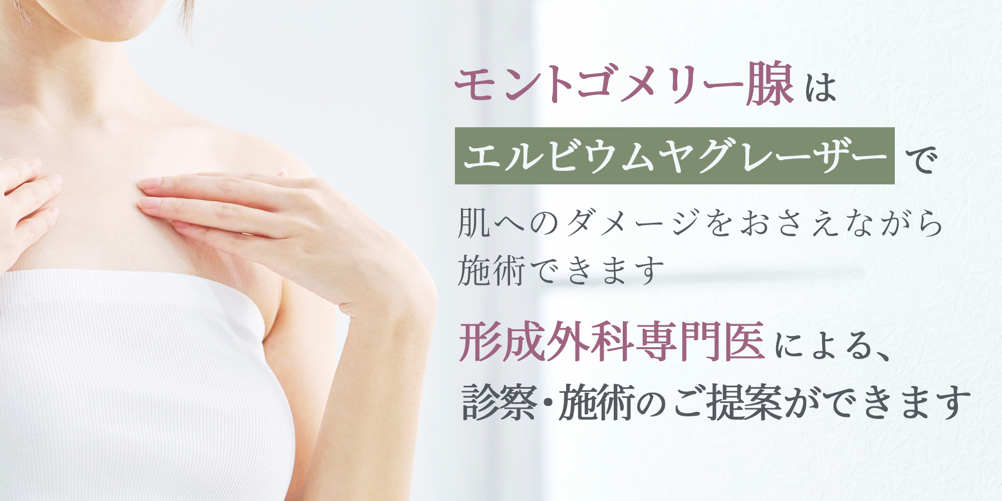 乳輪のブツブツであるモントゴメリー腺を除去に用いられるレーザーにはいくつかの種類がありますが、当クリニックではエルビウムヤグレーザーによる除去施術を行っています。