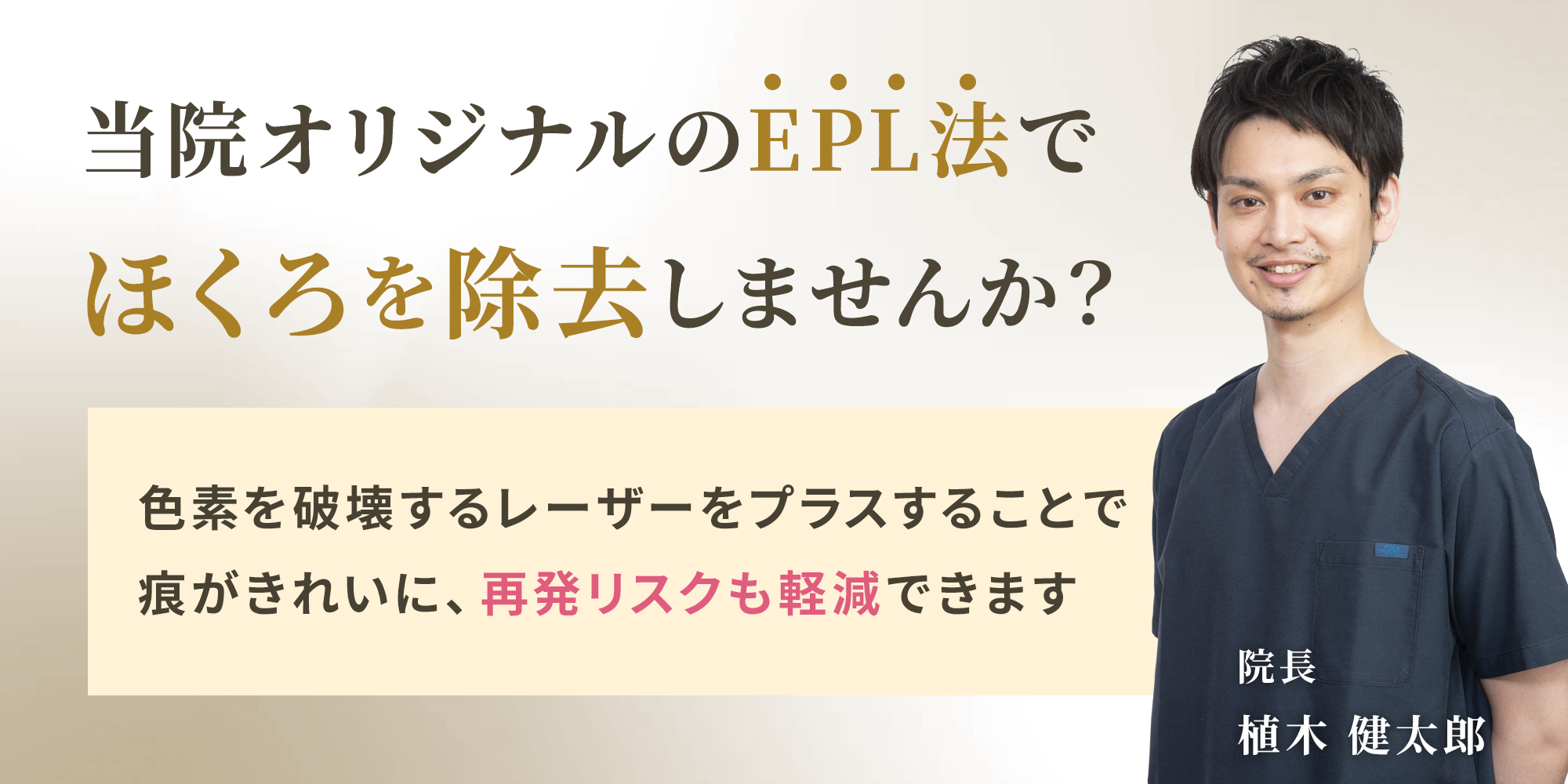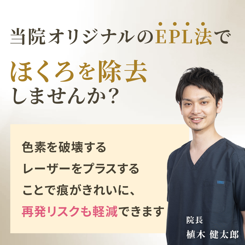 一般的にほくろをレーザーで除去する場合は皮膚を削るレーザーのみ使用いたしますが、EPL法は皮膚を削った直後に色素を破壊するレーザーをプラスして使用し、皮膚の深い部分に残ったほくろの色素を破壊します。